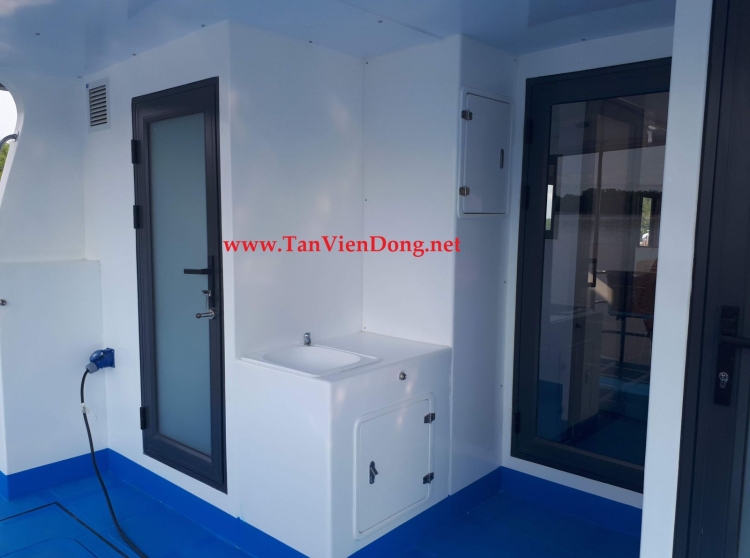 - Phần mũi bố trí cầu thang lên tầng trên, phần sau lái bố trí 02 bậc thang xuống nước hai bên ở giữa bố trí 01 băng ghế ngang khung Inox lót nhựa giả gổ.